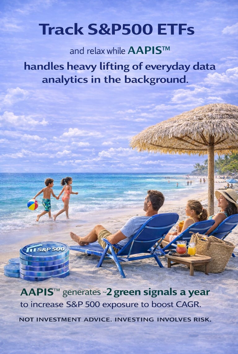 Track S&P 500 ETFs with confidence while AAPIS™ handles heavy lifting of everyday data analytics in the background. AAPIS™ generates approximately two “green” informational signals per year that highlight periods of increased S&P 500 market exposure based on its analytical models.